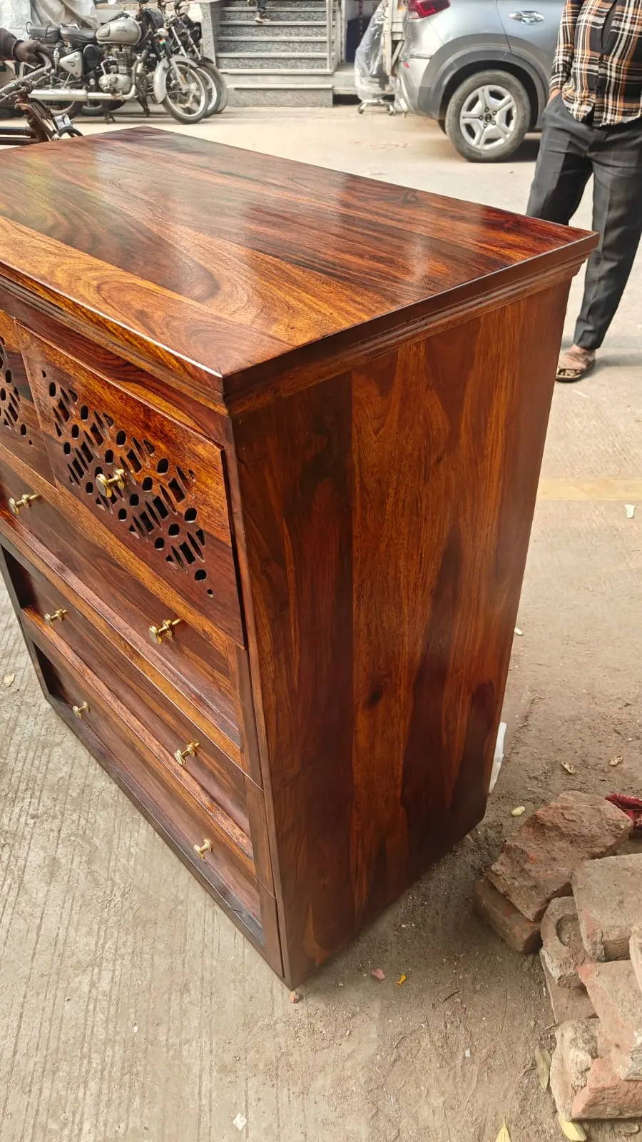 A design that blends robust structure with delicate carving demands a superior material. The Mira is handcrafted from 100% solid Sheesham wood, a premium hardwood celebrated for its incredible strength and the mesmerizing beauty of its grain. Sheesham's dense, interlocking grain is the perfect medium for the intricate latticework, allowing our artisans to carve with precision without fear of splintering. This ensures every detail is crisp and will remain so for generations. The drawers are constructed with time-honored joinery techniques and glide smoothly on wooden runners, a testament to the quality of the craftsmanship. Every Mira chest is a unique masterpiece, with its own distinct story told in the deep, swirling patterns of the Rosewood grain.