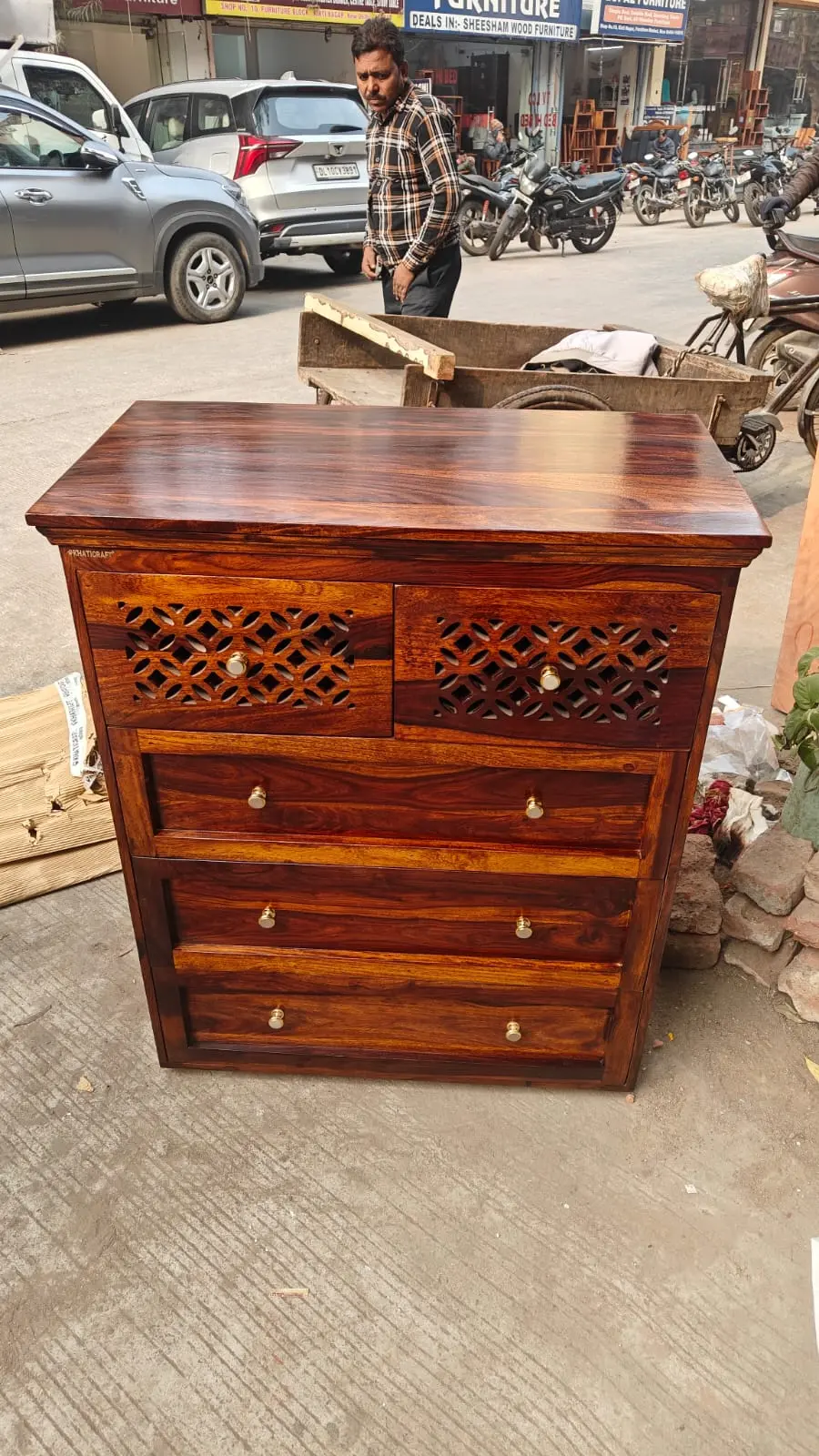 In the art of furniture design, true elegance is found in the balance between presence and grace, function and artistry. The Mira Solid Wood Chest of Drawers is a masterful expression of this balance. This is not merely a place to store your clothes; it is a piece of art that organizes your life. Standing at a stately and versatile height of 40 inches and offering a generous 33-inch width, the Mira is a substantial piece designed to be a captivating feature in any bedroom. Its unique design masterfully combines the practicality of deep, spacious drawers with the delicate, airy beauty of hand-carved latticework, creating a stunning visual dialogue between solid form and intricate detail. Crafted from 100% solid Sheesham wood, the Mira is a sophisticated choice for those who believe their functional pieces should also be their most beautiful.